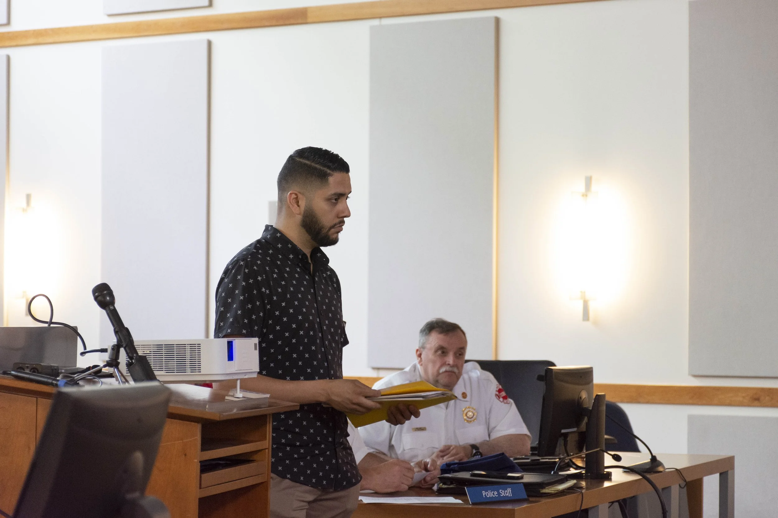 A representative from Mary Queen of Heaven Church stands before the Board of Trustees on Tuesday, June 14th, 2022 as the town clerk asks clarifying questions about their permit (Photo by April Alonso).